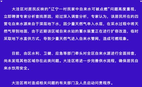 那么這家自來水為什么能被點(diǎn)燃呢?盤錦市大洼區(qū)委宣傳部,通報(bào)了調(diào)查結(jié)果