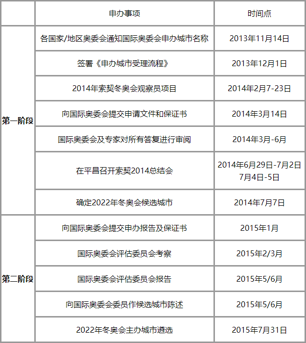 2013年6月6日,國際奧委會正式宣布啟動2022年第24屆冬季奧林匹克運動會的申辦程序。整個申辦程序包括兩個階段。